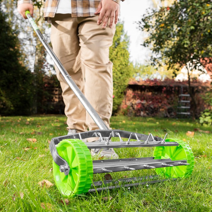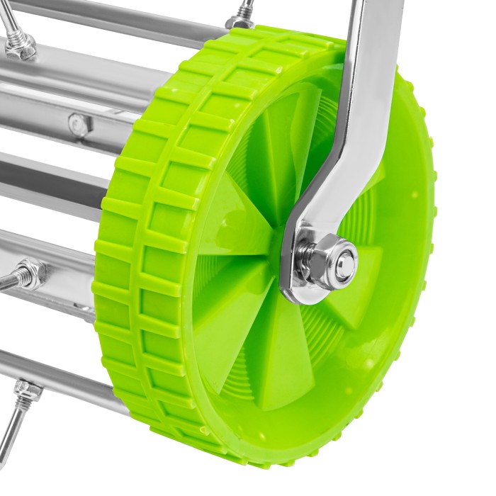 Ручной аэратор Palisad 62031 размером 440 х 1400 мм предназначен для ухода за газонной травой и усиления ее роста. Устраняет уплотнения в верхнем слое почвы, обеспечивает приток кислорода и влаги к корням, благодаря чему грунт насыщается питательными веществами и становится более стойким к засухе. Аэратор предназначен для использования на влажном газоне.ПреимуществаЭффективная работа без лишних усилий — аэратор с острыми шипами позволяет ускорить процесс естественного роста газона без использования удобрений.Экономия времени — ширина прохода 44 см позволяет выполнять работу быстрее.Долговечность — черенок и рабочая часть изготовлены из прочной стали и оцинкованы для защиты от коррозии.Легкое перемещение по газону — аэратор оснащен удобными пластиковыми колесами.Разборная конструкция — инструмент удобно транспортировать, а отверстие в черенке позволяет организовать подвесное хранение.