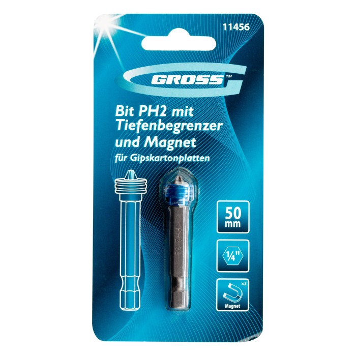 Бита Gross 11456 типоразмера PH2 x 50 мм, из стали S2, c ограничителем и магнитом, оптимально подходит для монтажа и демонтажа саморезов в гипсокартонные листы. Используется в качестве оснастки для шуруповертов и отверток. Благодаря встроенному ограничителю хода крепеж ввинчивается на необходимую глубину, что позволяет избежать повреждения материалов и экономит время мастера.ПреимуществаВстроенный магнит — крепеж надежно фиксируется в шлице биты, что позволяет работать шуруповертом одной рукой, а другой удерживать ГКЛ.Надежность и долговечность — бита изготовлена из японской легированной стали S2 повышенной износостойкости.Защита от воздействия влаги — на поверхность насадки нанесено антикоррозийное никелевое покрытие.Комфортная работа — шлиц не проскальзывает в головке крепежа, т.к. бита изготовлена на высокоточном оборудовании с максимальным контролем качества.