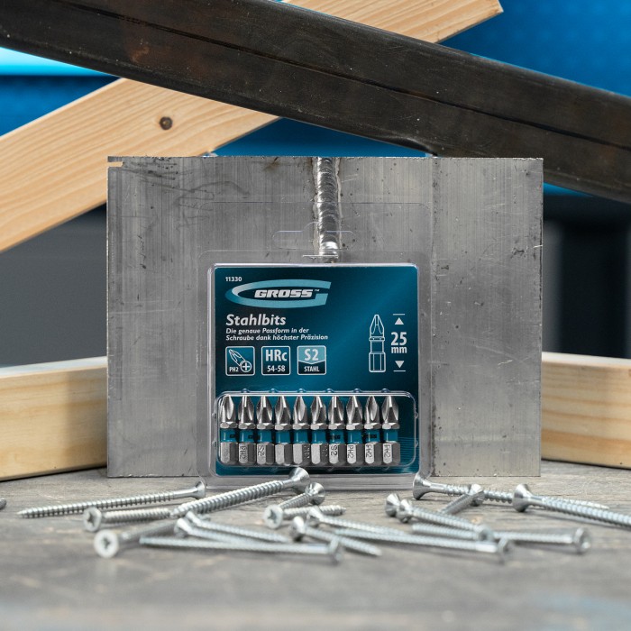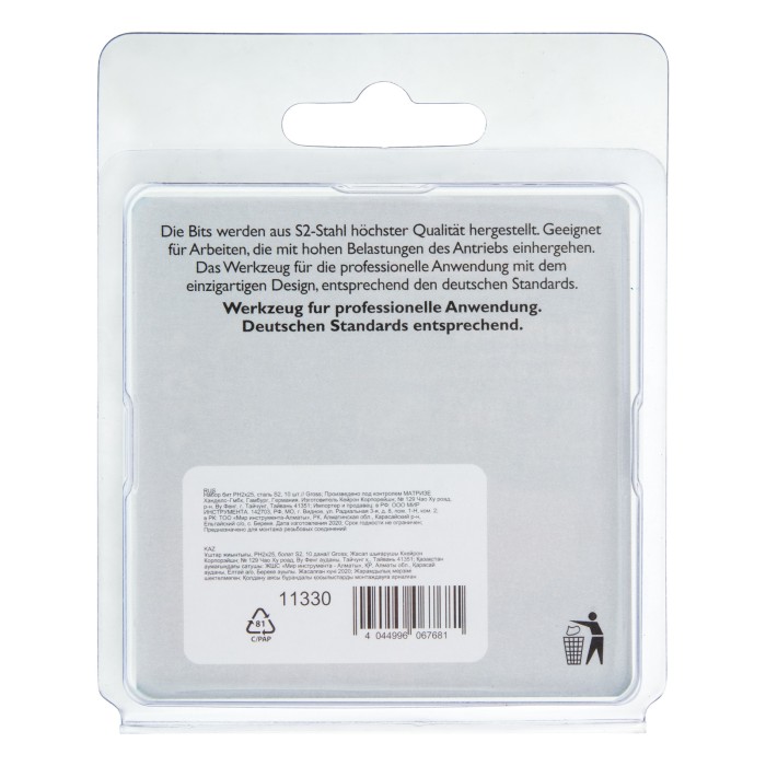 Набор бит Gross 11330 состоит из 10 наиболее востребованных крестообразных насадок типа PH2 длиной 25 мм, с хвостовиком 1/4 дюйма, изготовленных из стали S2 и предназначенных для использования с шуруповертами и отвертками-адаптерами. За счет оптимальной геометрии и высокой точности исполнения шлица биты не проскальзывают в головках крепежа. Оснастки используются для монтажа и демонтажа саморезов по дереву, шурупов и других резьбовых крепежей.ПреимуществаИзносостойкость и долговечность — биты изготовлены из японской легированной стали S2 твердостью 54-58 HRC, поэтому долго сохраняют рабочие свойства.Намагниченный шлиц — можно направлять шуруповерт с насаженным крепежом одной рукой, а другой придерживать закрепляемую деталь.Коррозионная стойкость — никелированная поверхность устойчива к появлению ржавчины.Защита от подделок — на каждой бите имеется цветное кольцо с логотипом ТМ Gross.Удобная упаковка — оснастка поставляется в жестком блистере с европодвесом.Продуманная комплектация — запаса из 10 штук хватит на целую бригаду.Высокое качество исполнения — насадки произведены на Тайване под строгим технологическим контролем.