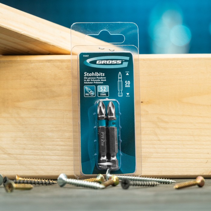 Набор бит Gross 11357 состоит из 2 наиболее востребованных крестообразных насадок типа PH2 длиной 50 мм, с хвостовиком 1/4 дюйма, изготовленных из стали S2 и предназначенных для использования с шуруповертами и отвертками-адаптерами. За счет оптимальной геометрии и высокой точности исполнения шлица биты не проскальзывают в головках крепежа. Оснастки используются для монтажа и демонтажа саморезов по дереву, шурупов и других резьбовых крепежей.ПреимуществаИзносостойкость и долговечность — биты изготовлены из японской легированной стали S2 твердостью 54-58 HRC, поэтому долго сохраняют рабочие свойства.Намагниченный шлиц — можно направлять шуруповерт с насаженным крепежом одной рукой, а другой придерживать закрепляемую деталь.Коррозионная стойкость — никелированная поверхность устойчива к появлению ржавчины.Защита от подделок — на каждой бите имеется цветное кольцо с логотипом ТМ Gross.Удобная упаковка — оснастка поставляется в жестком блистере с европодвесом.Высокое качество исполнения — насадки произведены на Тайване под строгим технологическим контролем.