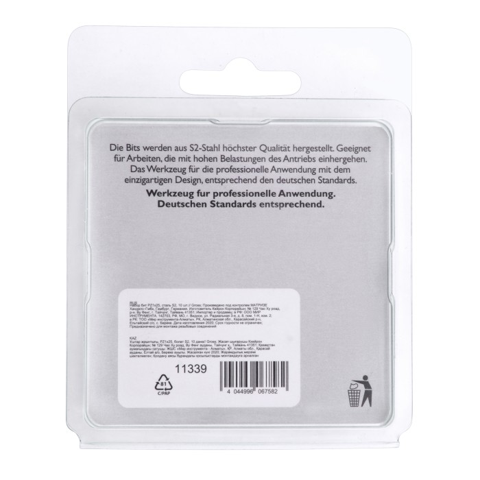 Набор бит Gross 11339 состоит из 10 насадок типоразмера PZ1 и длиной 25 мм, с хвостовиком 1/4 дюйма, изготовленных из стали S2 и предназначенных для шуруповертов. Оснастки служат для монтажа и демонтажа шурупов, саморезов и других резьбовых соединений. Шлиц PZ имеет 4 дополнительных ребра, благодаря чему предотвращается проскальзывание биты в крепеже, повышаются точность и эффективность работ.ПреимуществаИзносостойкость и долговечность — биты изготовлены из японской легированной стали S2 твердостью 54-58 HRC, поэтому долго сохраняют рабочие свойства.Намагниченный шлиц — можно направлять шуруповерт с насаженным крепежом одной рукой, а другой придерживать закрепляемую деталь.Коррозионная стойкость — никелированная поверхность устойчива к появлению ржавчины.Защита от подделок — на каждой бите имеется цветное кольцо с логотипом ТМ Gross.Удобная упаковка — оснастка поставляется в жестком блистере с европодвесом.Продуманная комплектация — запаса из 10 штук хватит на целую бригаду.Высокое качество исполнения — насадки произведены на Тайване под строгим технологическим контролем.