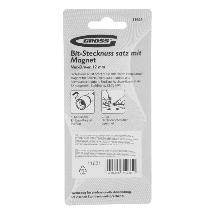 Бита с торцевой головкой Gross Nut-Driver 11621 из стали S2, размером 12 мм, с магнитом, применяется в качестве профессиональной оснастки для шуруповертов. Она предназначена для монтажа и демонтажа болтов, шурупов и кровельных саморезов, имеющих шестигранную головку. Насадка выдерживает интенсивные нагрузки и сохраняет рабочие свойства даже при длительном использовании.ПреимуществаПрочность и высокий ресурс — корпус изготовлен из японской легированной стали S2 твердостью 52-56 HRC.Встроенный магнит — крепеж не выпадает из биты, при этом мастер может придерживать свободной рукой закрепляемую деталь.Комфортная работа — благодаря вращающейся гильзе-воротнику удобно удерживать биту и стабилизировать крепежный элемент.