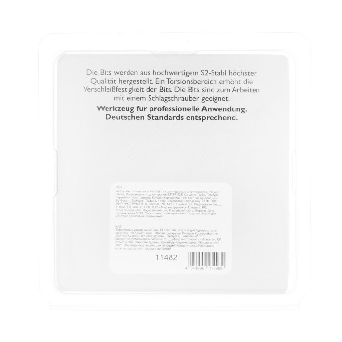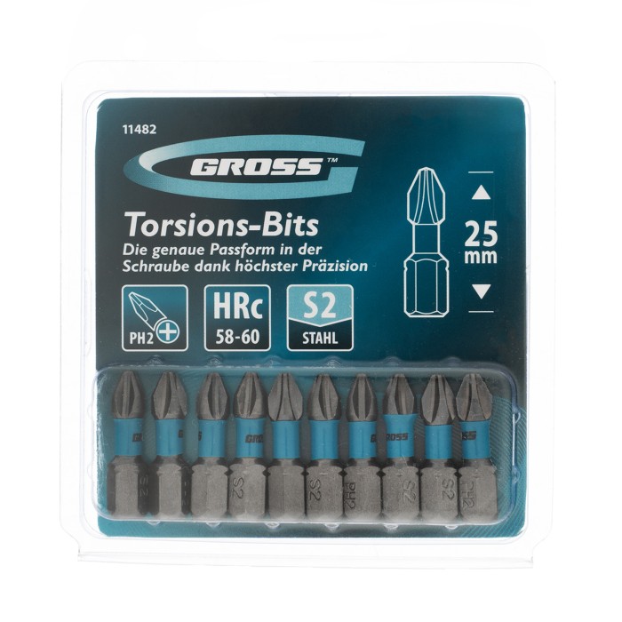 Набор торсионных бит PH2 x 25 мм Gross 11482, 10 шт., предназначен для монтажа и демонтажа резьбовых соединений с помощью ударного шуруповерта. Он незаменим в строительных, слесарных и монтажных работах, в автосервисах, при проведении ремонта в доме. Торсионная зона способна пружинить, за счет чего она частично амортизирует тангенциальный удар от шуруповерта. Такое решение позволяет равномерно распределить нагрузку по бите и избежать поломки шлица.ПреимуществаПродуманная конструкция — торсионная зона позволяет работать ударным шуруповертом даже с особо твердыми поверхностями без риска поломки бит.Высококачественный материал изготовления — японская легированная сталь S2 обеспечивает устойчивость бит к износу и увеличивает их ресурс.Износостойкость — биты закалены до твердости 58-60 HRC, что повышает сопротивляемость к деформации.Надежная фиксация насадок — шлицы бит намагничены, поэтому крепеж не выпадет, а мастер сможет свободной рукой придерживать закрепляемый материал.Защита от подделок — синее кольцо с логотипом ТМ Gross подтверждает оригинальность товара.Удобное хранение — насадки поставляются в блистере с европодвесом, который можно вешать на стенд.10 бит в комплекте — набора хватит на небольшую производственную бригаду.