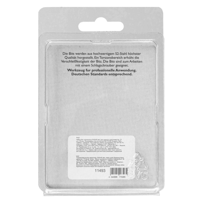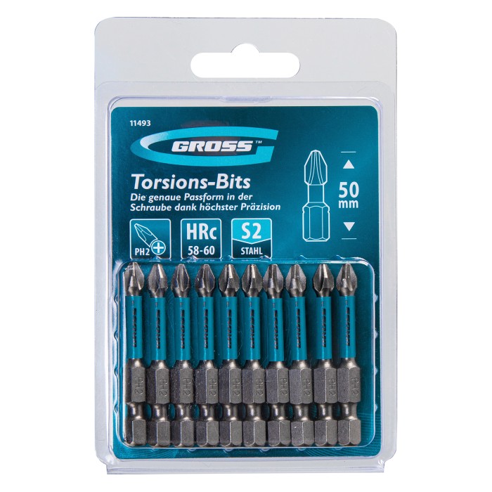 Набор торсионных бит PH2 x 50 мм Gross 11493, 10 шт., предназначен для монтажа и демонтажа резьбовых соединений с помощью ударного шуруповерта. Он незаменим в строительных, слесарных и монтажных работах, в автосервисах, при проведении ремонта в доме. Торсионная зона способна пружинить, за счет чего она частично амортизирует тангенциальный удар от шуруповерта. Такое решение позволяет равномерно распределить нагрузку по бите и избежать поломки шлица.ПреимуществаПродуманная конструкция — торсионная зона позволяет работать ударным шуруповертом даже с особо твердыми поверхностями без риска поломки бит.Высококачественный материал изготовления — японская легированная сталь S2 обеспечивает устойчивость бит к износу и увеличивает их ресурс.Износостойкость — биты закалены до твердости 58-60 HRC, что повышает сопротивляемость к деформации.Надежная фиксация насадок — шлицы бит намагничены, поэтому крепеж не выпадет, а мастер сможет свободной рукой придерживать закрепляемый материал.Защита от подделок — синее кольцо с логотипом ТМ Gross подтверждает оригинальность товара.Удобное хранение — насадки поставляются в блистере с европодвесом, который можно вешать на стенд.10 бит в комплекте — набора хватит на небольшую производственную бригаду.