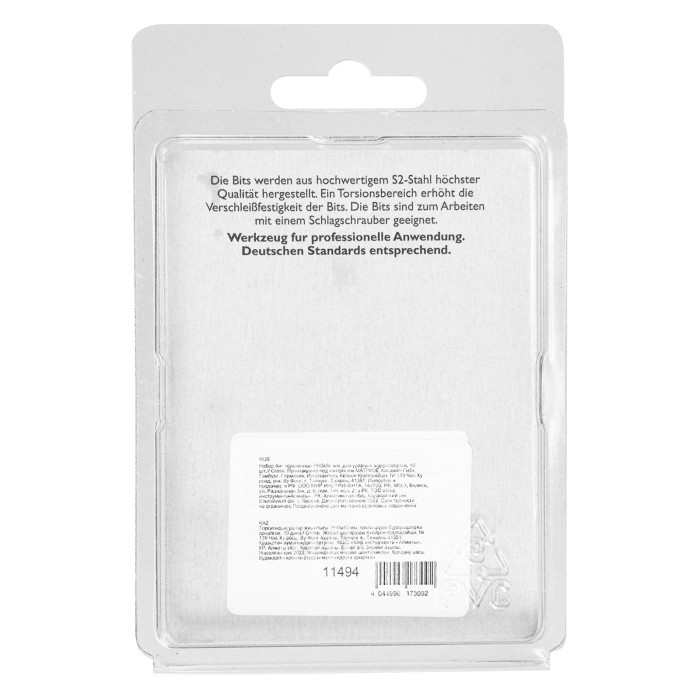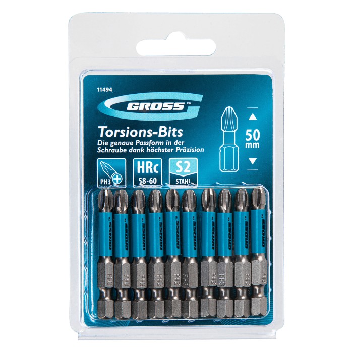 Набор торсионных бит PH3 x 50 мм Gross 11494, 10 шт., предназначен для монтажа и демонтажа резьбовых соединений с помощью ударного шуруповерта. Он незаменим в строительных, слесарных и монтажных работах, в автосервисах, при проведении ремонта в доме. Торсионная зона способна пружинить, за счет чего она частично амортизирует тангенциальный удар от шуруповерта. Такое решение позволяет равномерно распределить нагрузку по бите и избежать поломки шлица.ПреимуществаПродуманная конструкция — торсионная зона позволяет работать ударным шуруповертом даже с особо твердыми поверхностями без риска поломки бит.Высококачественный материал изготовления — японская легированная сталь S2 обеспечивает устойчивость бит к износу и увеличивает их ресурс.Износостойкость — биты закалены до твердости 58-60 HRC, что повышает сопротивляемость к деформации.Надежная фиксация насадок — шлицы бит намагничены, поэтому крепеж не выпадет, а мастер сможет свободной рукой придерживать закрепляемый материал.Защита от подделок — синее кольцо с логотипом ТМ Gross подтверждает оригинальность товара.Удобное хранение — насадки поставляются в блистере с европодвесом, который можно вешать на стенд.10 бит в комплекте — набора хватит на небольшую производственную бригаду.