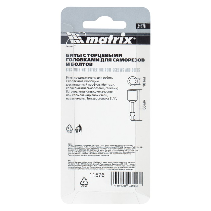 Биты с торцевыми головками Matrix 11576 размером 10 х 65 мм, 2 шт. в уп., предназначены для работ с шуруповертом. Используются при монтаже и демонтаже болтов и шурупов, а также кровельных саморезов с внешним шестигранник...