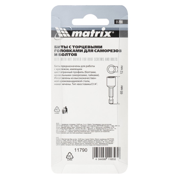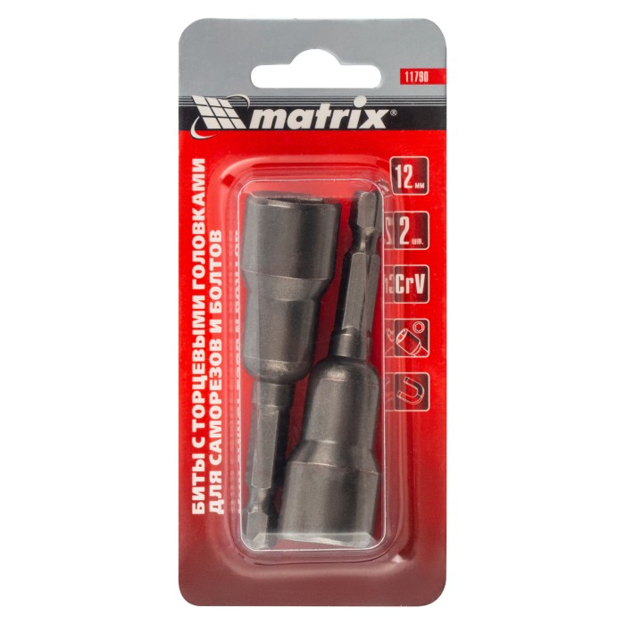 Биты с торцевыми головками Matrix 11790 размером 12 х 65 мм, 2 шт. в уп., предназначены для работ с шуруповертом. Используются при монтаже и демонтаже болтов и шурупов, а также кровельных саморезов с внешним шестигранник...