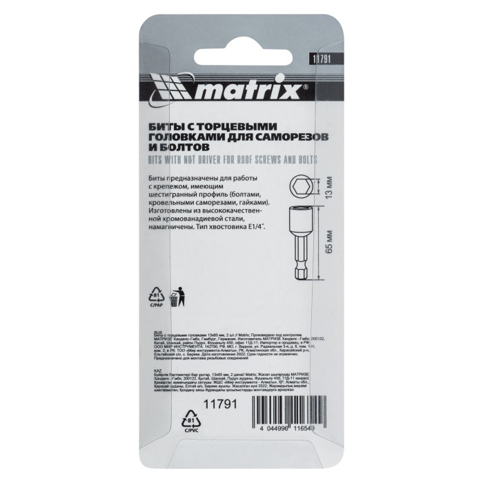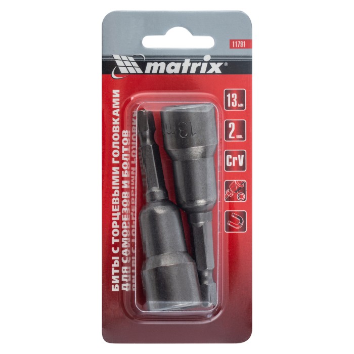 Биты с торцевыми головками Matrix 11791 размером 13 х 65 мм, 2 шт. в уп., предназначены для работ с шуруповертом. Используются при монтаже и демонтаже болтов и шурупов, а также кровельных саморезов с внешним шестигранник...