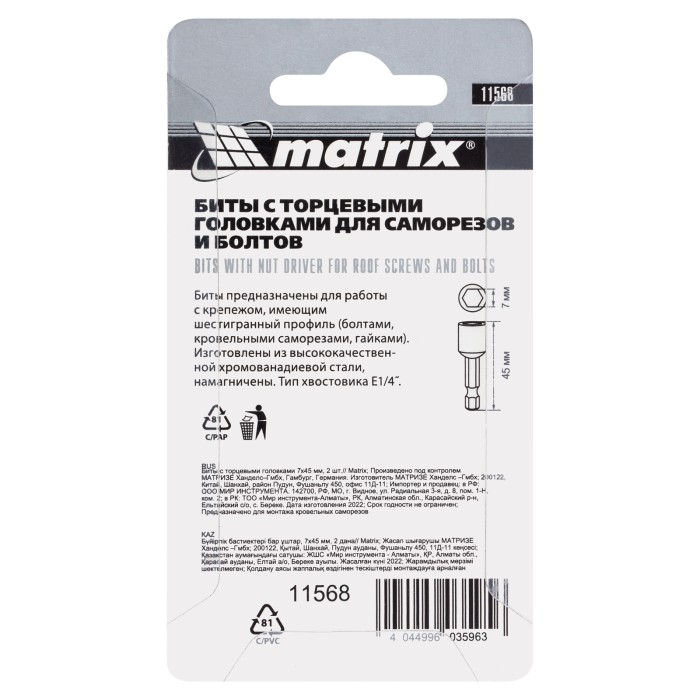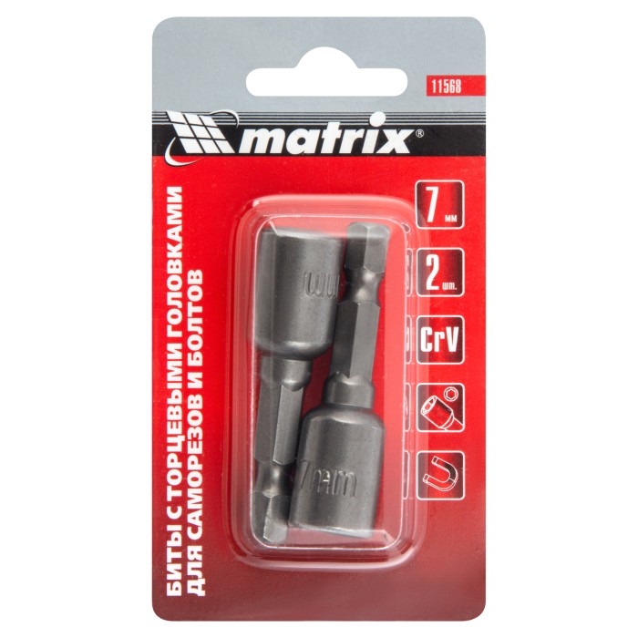 Биты с торцевыми головками Matrix 11568 размером 7 х 45 мм, 2 шт. в уп., предназначены для работ с шуруповертом. Используются при монтаже и демонтаже болтов и шурупов, а также кровельных саморезов с внешним шестиграннико...