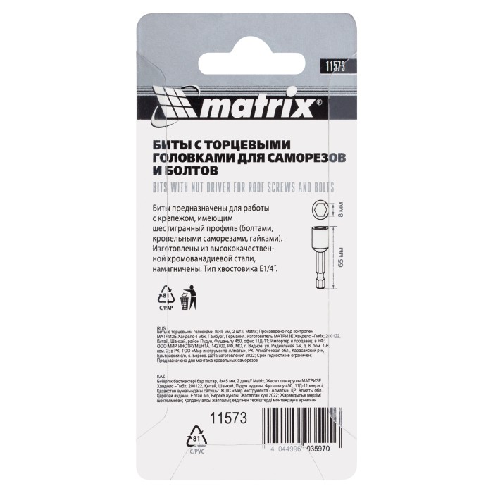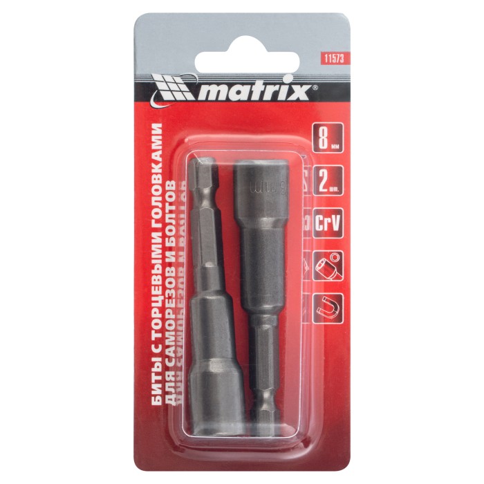 Биты с торцевыми головками Matrix 11573 размером 8 х 65 мм, 2 шт. в уп., предназначены для работ с шуруповертом. Используются при монтаже и демонтаже болтов и шурупов, а также кровельных саморезов с внешним шестиграннико...