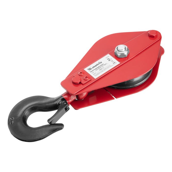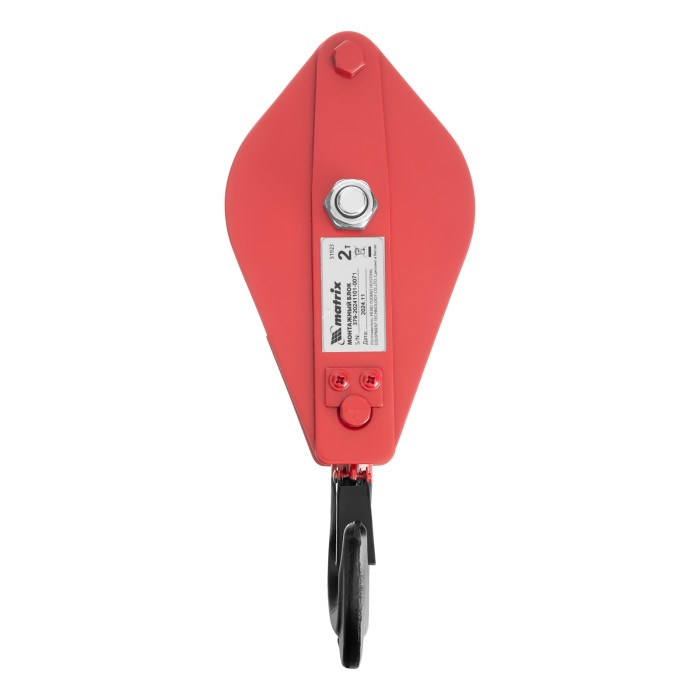 Монтажный блок Matrix 51923 с крюком, грузоподъемностью 2 т, расширяет функциональные возможности ручного и электрического грузоподъемного оборудования. Позволяет менять направление движения груза, а также увеличивает по...