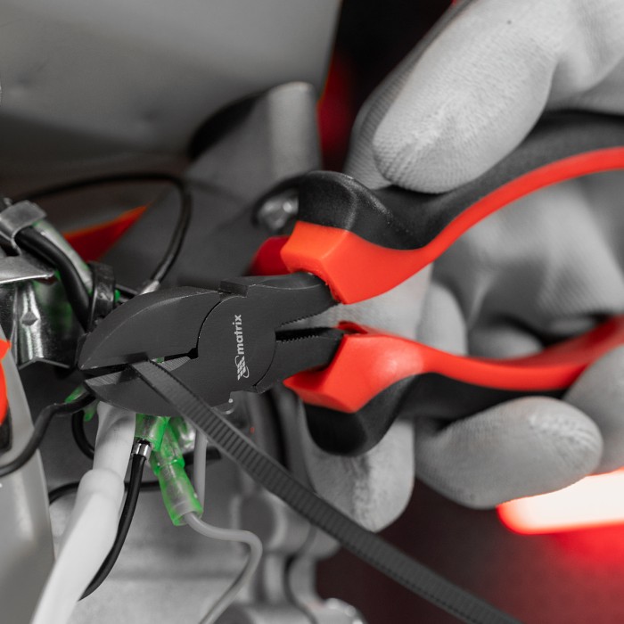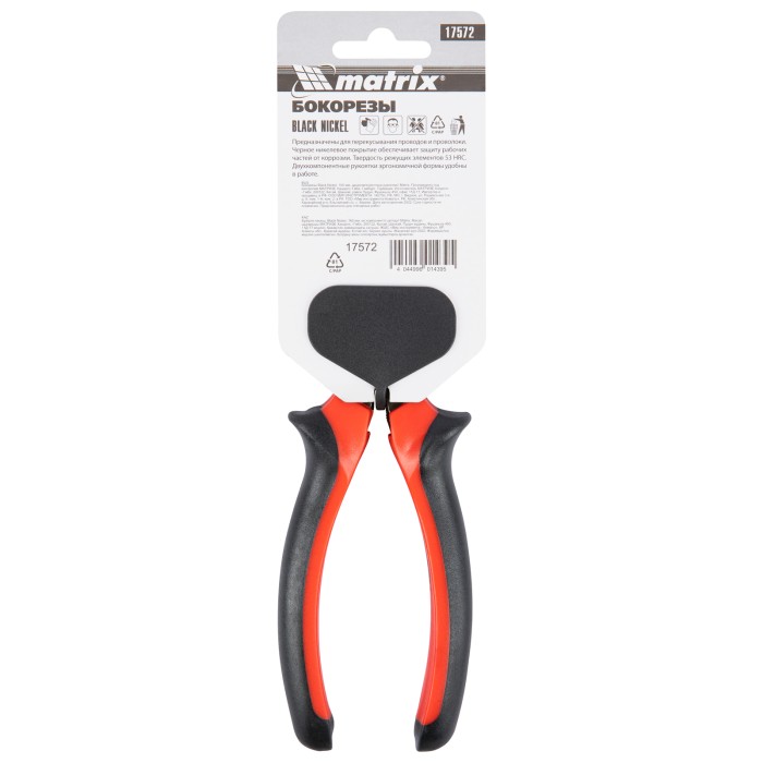Бокорезы Matrix Black Nickel 17572 длиной 160 мм, с двухкомпонентными рукоятками, используются для разрезания проводов, кабелей, проволоки и перекусывания гвоздей. Пригодятся как начинающим мастерам, так и профессионалам для проведения монтажных и ремонтных работ.ПреимуществаЭффективность без лишних затрат — удлиненное шарнирное соединение позволяет выполнять работы с минимальными усилиями.Прочность и высокий ресурс — губки выполнены из качественной углеродистой стали 45 твердостью 53 HRC.Защита от коррозии и износоустойчивость — на рабочие части нанесено черное никелевое покрытие.Безопасная эксплуатация — благодаря упорам на рукоятках пальцы не соскальзывают к режущим элементам.Комфортная работа — двухкомпонентные эргономичные рукоятки обеспечивают надежный хват.
