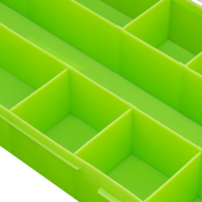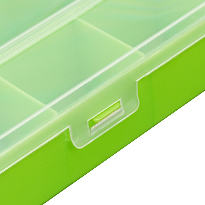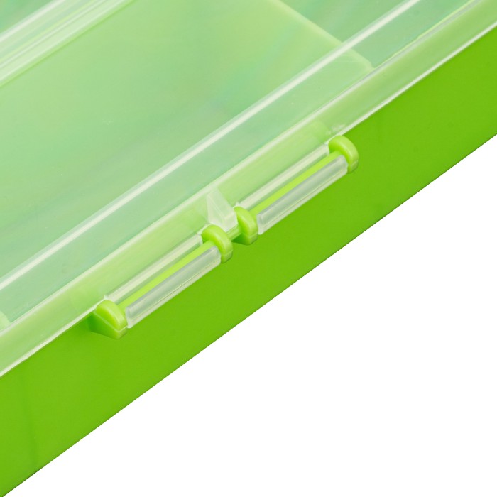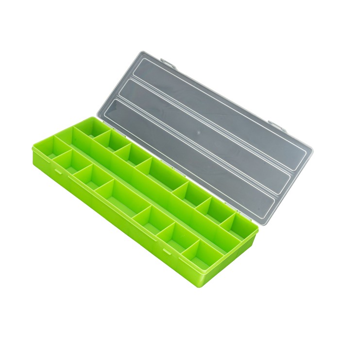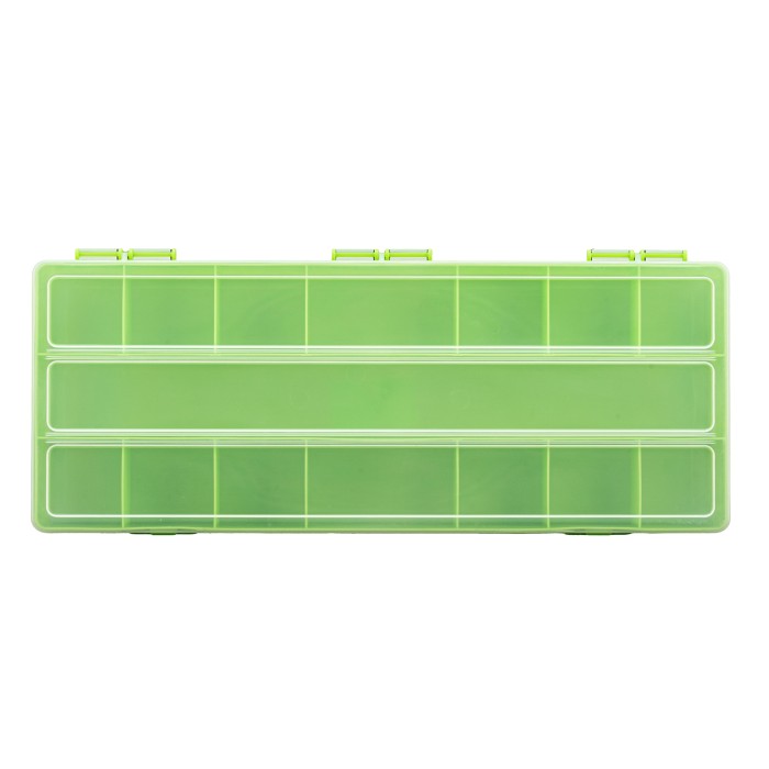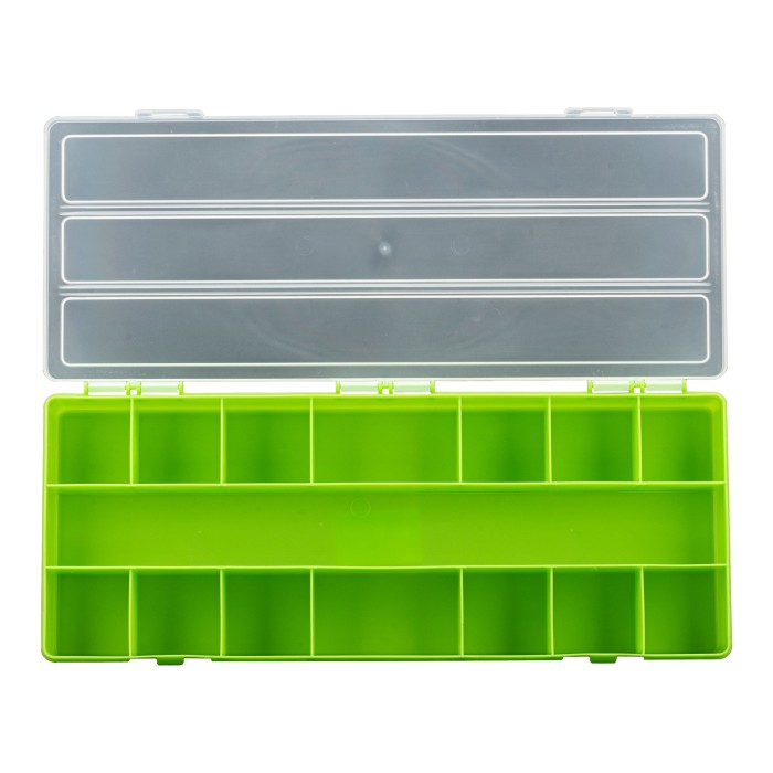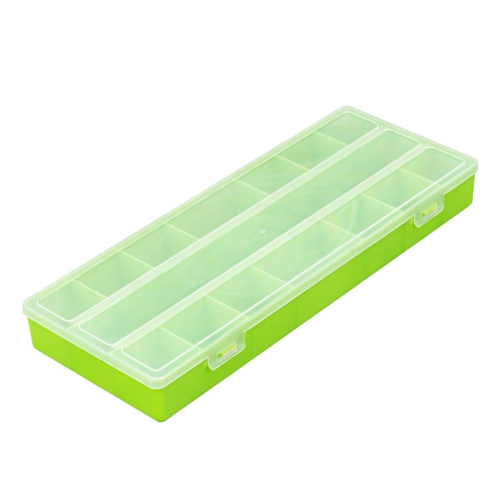 Универсальный бокс Сибртех 90732 размером 382 х 152 х 45 мм используется для хранения и транспортировки мелочей. В него можно положить украшения, снасти, крепежные элементы, канцтовары и др. Контейнер позволит сэкономить пространство, а также упорядочить вещи для более удобного поиска. За счет компактных размеров блок легко поместится в ящике с инструментами, комоде или на столе.ПреимуществаПолипропиленовый бокс надежно защищает содержимое от пыли и брызг воды.Бокс оснащен 15 большими и маленькими секциями для хранения вещей разного размера и формы.Благодаря прозрачной крышке содержимое блока можно увидеть без ее открытия.