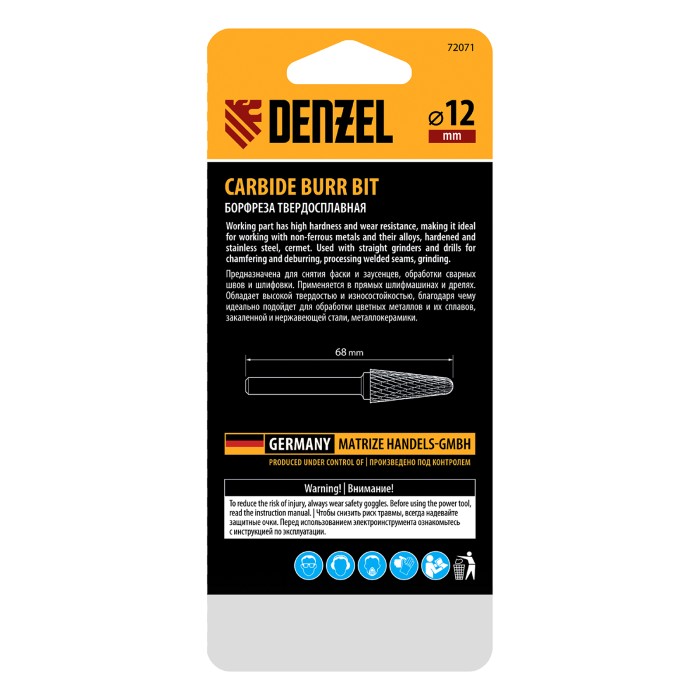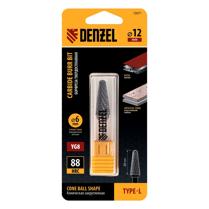 Борфреза по металлу твердосплавная, коническая закругленная, тип-L, 12 мм Denzel