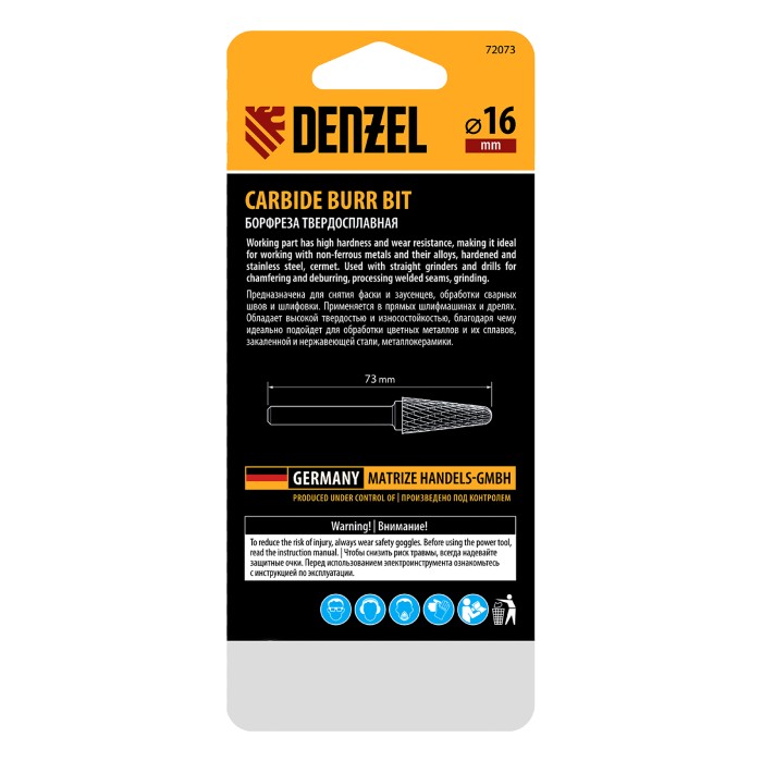 Твердосплавная борфреза Denzel 72073 с конической закругленной режущей частью (тип L), диаметром 16 мм, предназначена для выполнения работ по металлу. Используется для шлифовки, снятия фасок, удаления заусенцев, зачистки...