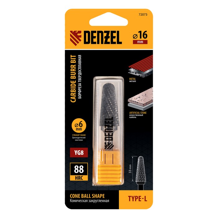 Твердосплавная борфреза Denzel 72073 с конической закругленной режущей частью (тип L), диаметром 16 мм, предназначена для выполнения работ по металлу. Используется для шлифовки, снятия фасок, удаления заусенцев, зачистки сварных швов. восстановления гравировки. Оптимальна для обработки труднодоступных мест. Оснастка устанавливается на дрель или прямошлифовальную машину, подходит для работы с закаленной и нержавеющей сталью, чугуном, бронзой, медью, латунью, титаном, а также металлокерамикой и искусственным камнем.ПреимуществаЭффективная работа с особо прочными материалами — рабочая часть изготовлена из сплава ВК8 твердостью 69-72 HRC.Высокая производительность — специальные перекрестные насечки-стружколомы обеспечивают эффективное удаление продуктов обработки.Универсальность — цилиндрический хвостовик диаметром 6 мм совместим с большинством патронов инструментов.Удобное хранение и транспортировка — борфреза поставляется в практичном пластиковом кейсе.
