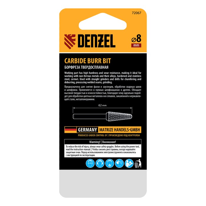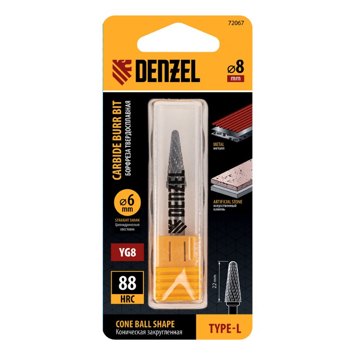 Твердосплавная борфреза Denzel 72067 с конической закругленной режущей частью (тип L), диаметром 8 мм, предназначена для выполнения работ по металлу. Используется для шлифовки, снятия фасок, удаления заусенцев, зачистки сварных швов. восстановления гравировки. Оптимальна для обработки труднодоступных мест. Оснастка устанавливается на дрель или прямошлифовальную машину, подходит для работы с закаленной и нержавеющей сталью, чугуном, бронзой, медью, латунью, титаном, а также металлокерамикой и искусственным камнем.ПреимуществаЭффективная работа с особо прочными материалами — рабочая часть изготовлена из сплава ВК8 твердостью 69-72 HRC.Высокая производительность — специальные перекрестные насечки-стружколомы обеспечивают эффективное удаление продуктов обработки.Универсальность — цилиндрический хвостовик диаметром 6 мм совместим с большинством патронов инструментов.Удобное хранение и транспортировка — борфреза поставляется в практичном пластиковом кейсе.