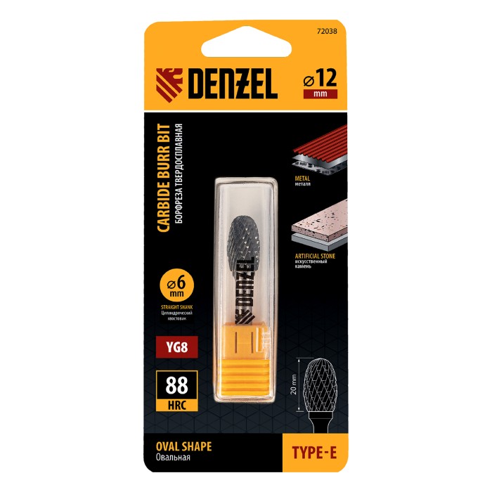 Твердосплавная борфреза по металлу Denzel 72038 с овальной режущей частью (тип E), диаметром 12 мм, предназначена для шлифовки стальных, бронзовых, медных, латунных, чугунных, титановых поверхностей. Также эффективна для...
