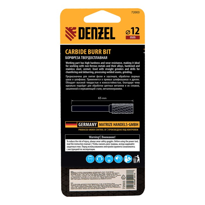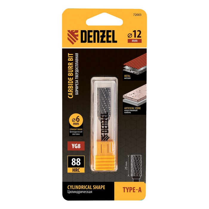 Твердосплавная борфреза Denzel 72003 с цилиндрической рабочей частью (тип A), диаметром 12 мм, используется для работ по металлу (закаленной и нержавеющей стали, латуни, меди, бронзе, чугуну, титану). Подходит также для ...