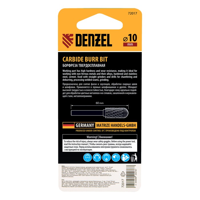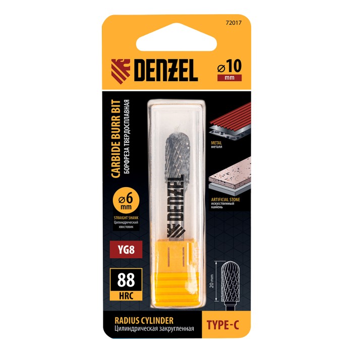 Твердосплавная борфреза Denzel 72017 с цилиндрической закругленной рабочей частью (тип C), диаметром 10 мм, предназначена для шлифовальных работ по металлу: закаленной и нержавеющей стали, латуни, чугуну, бронзе, титану,...
