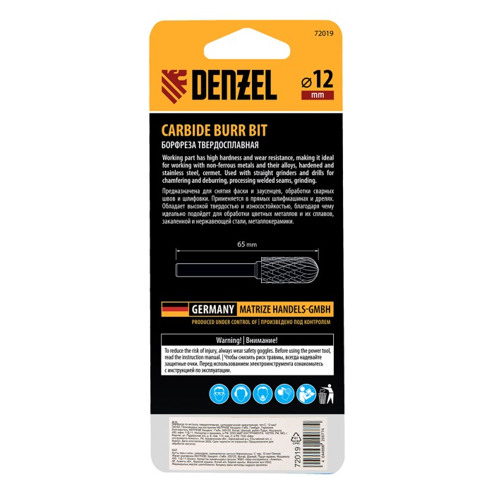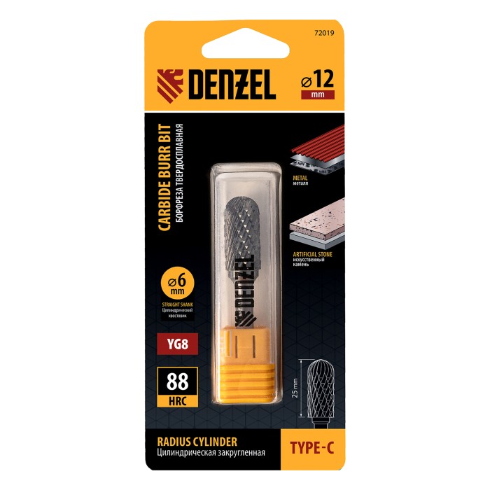Твердосплавная борфреза Denzel 72019 с цилиндрической закругленной рабочей частью (тип C), диаметром 12 мм, предназначена для шлифовальных работ по металлу: закаленной и нержавеющей стали, латуни, чугуну, бронзе, титану,...