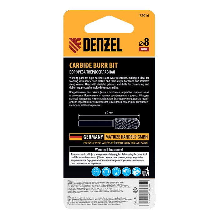 Твердосплавная борфреза Denzel 72016 с цилиндрической закругленной рабочей частью (тип C), диаметром 8 мм, предназначена для шлифовальных работ по металлу: закаленной и нержавеющей стали, латуни, чугуну, бронзе, титану, ...