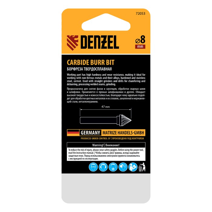 Твердосплавная борфреза по металлу Denzel 72053 с рабочей частью-зенкером с вершиной 60° (тип J), диаметром 8 мм, устанавливается на дрель или прямошлифовальную машину. Используется для обработки закаленной и нержавеющей...