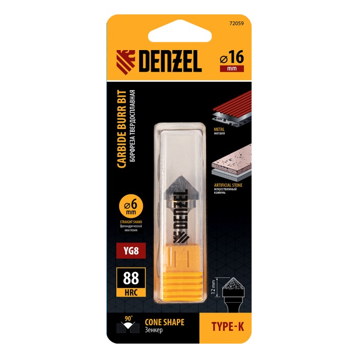 Борфреза по металлу твердосплавная, зенкер 90 град., тип-K, 16 мм Denzel