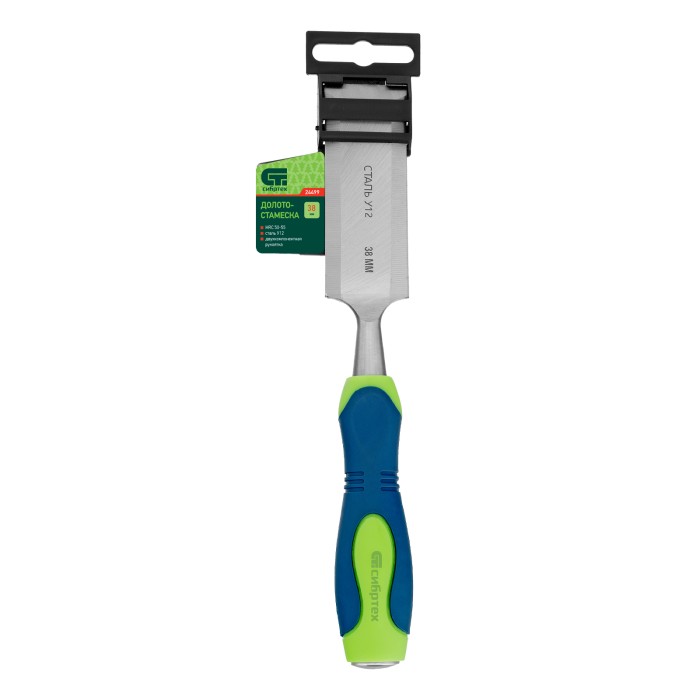 Долото-стамеска Сибртех 24499 с двухкомпонентной рукояткой — ручной инструмент с шириной режущей части 38 мм для столярных и плотницких работ с массивом натурального дерева. Под ударом киянки или небольшого молотка долото-стамеска легко врезается в древесину любых пород, что позволяет получать аккуратные прямоугольные пазы, снимать фаски, зачищать гнезда и т.д.ПреимуществаПрочность — полотно стамески изготовлено из высококачественной конструкционной углеродистой стали 55.Долговечность — полотно на 2/3 длины рабочей части закалено до твердости 50-55 HRC, поэтому инструмент долго сохраняет остроту.Высокая эффективность — режущая часть остро заточена на заводе под углом 20-35 градусов, что обеспечивает качественную работу и аккуратный результат.Защита от разрушения — металлический затыльник предотвращает деформацию рукоятки под воздействием киянки или молотка.Эргономичность — обрезиненная двухкомпонентная рукоятка не выскальзывает из руки и обеспечивает комфортную работу.