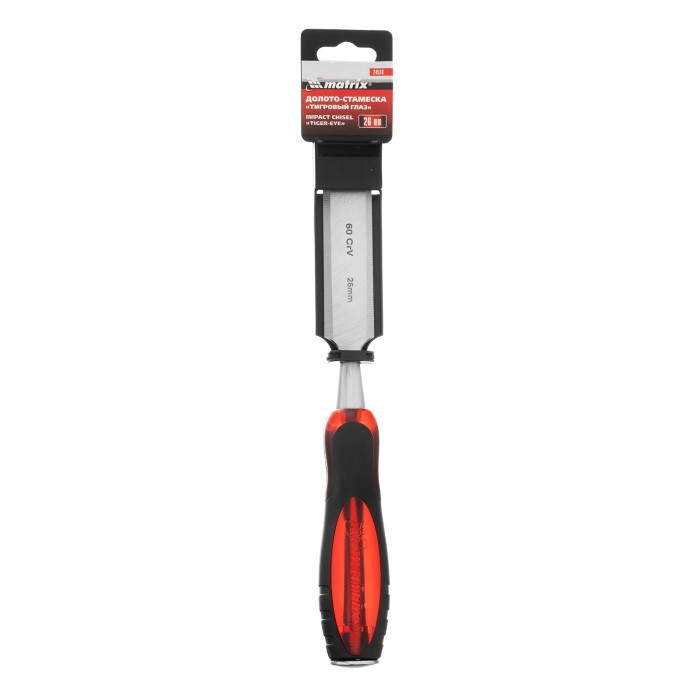 Долото-стамеска Matrix «Тигровый глаз» 24518 с полотном шириной 26 мм и двухкомпонентной обрезиненной рукояткой используется в столярном и плотницком деле, в производстве мебели. Позволяет вырезать углубления, формировать пазы, зачищать шипы и гнезда, снимать фаски. Инструмент выдерживает удары киянкой или молотком, т. к. металлический затыльник защищает его от деформации. Долото относится к профессиональному ручному инструменту, но может применяться и в домашних условиях.ПреимуществаПовышенная прочность — полотно выполнено из легированной хромованадиевой стали.Длительное сохранение режущих свойств — долото-стамеска обладает твердостью 65 HRC (0,7 длины рабочей части полотна), острое, как бритва, лезвие обработано на заводе под углом 20-35°, повторная заточка потребуется минимум через 6 месяцев.Продуманная конструкция — металлический стержень, проходящий сквозь рукоятку, повышает прочность и долговечность инструмента.Комфортная эксплуатация — двухкомпонентная рукоятка с резиновыми вставками и упорами под пальцы не скользит в руке и снижает усталость во время работы.