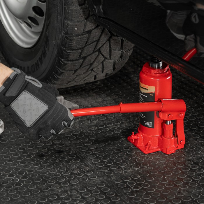 Гидравлический бутылочный домкрат Sparta 50323 рассчитан на подъем грузов весом до 5 т на высоту от 195 до 380 мм. Он пригодится как автолюбителям в гараже, так и профессиональным мастерам в автосервисах. Домкрат обеспечивает плавный подъем груза без особых усилий со стороны пользователя.ПреимуществаНадежность и долговечность — основание изготовлено из высокопрочного чугуна.Ремонтопригодность — корпус крепится станине с помощью резьбового соединения.Удобное хранение и транспортировка — домкрат оборудован съемным рычагом и весит 3,62 кг.