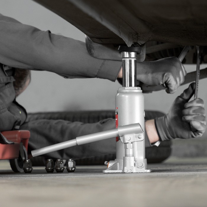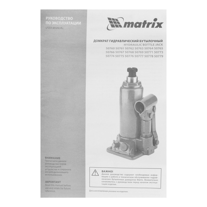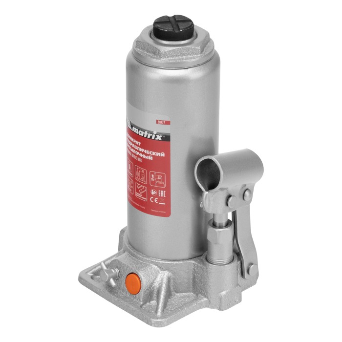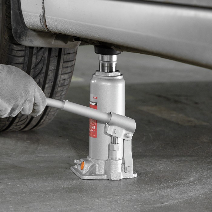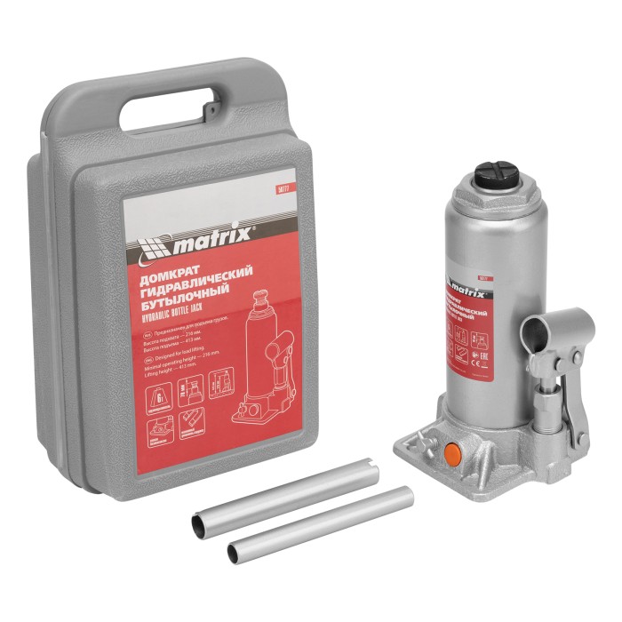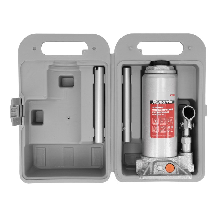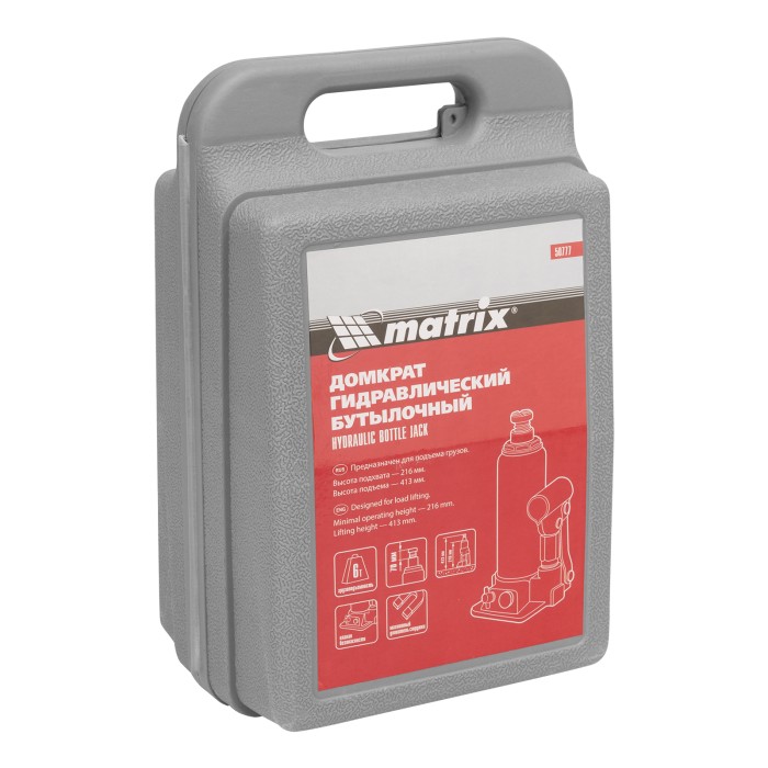 Гидравлический бутылочный домкрат Matrix 50777 позволяет быстро поднимать грузы массой до 6 т на высоту 216-413 мм. Встроенный магнитный уловитель собирает металлическую стружку, предотвращая преждевременный износ резиновых уплотнителей. Домкрат пригодится для полупрофессионального применения.ПреимуществаБезопасность — предохранительный клапан защищает домкрат от перегрузок, не позволяя поднимать автомобиль массой более 6000 кг.Надежность и долговечность — устройство изготовлено из высокопрочной коррозионностойкой стали.Разборная конструкция — корпус можно отсоединить от станины для ремонта или прочистки изделия.Удобная транспортировка — домкрат комплектуется прочным пластиковым кейсом.