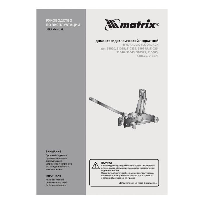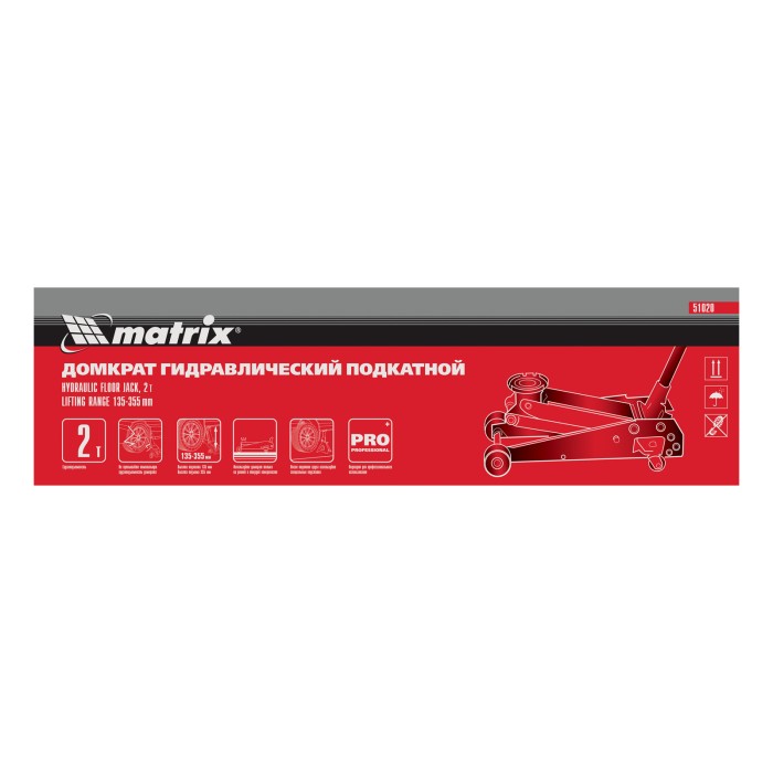Подкатной гидравлический домкрат Matrix 51020 с высотой подхвата 135 мм, — полупрофессиональное гаражное оборудование, способное поднимать груз массой до 2 т на высоту до 355 мм. Высота подхвата 135 мм позволяет использовать домкрат для автомашин со стандартным клиренсом. Домкрат будет полезен как в автомастерской, так и в частном гараже.ПреимуществаНадежность — усиленная конструкция выдерживает интенсивное использование.Коррозионная стойкость — на инструмент нанесено защитное покрытие.Безопасная эксплуатация — предохранительный клапан препятствует подъему груза массой более 2 т, предотвращая поломку домкрата.Мобильность — благодаря транспортировочной ручке домкрат удобно перемещать по рабочей зоне.Компактность — домкрат размером 492 х 215 х 135 мм легко помещается в багажник автомобиля.