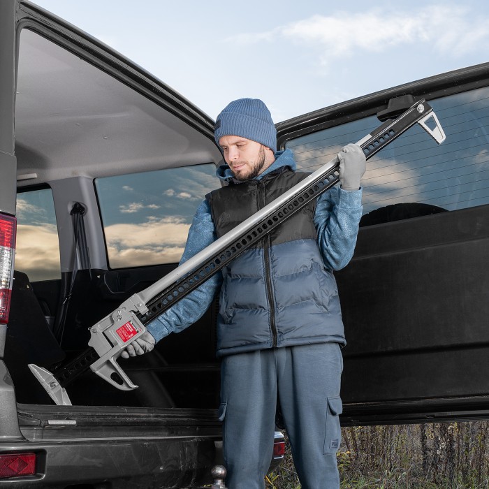Реечный домкрат Matrix High Jack 505195 позволяет поднимать внедорожники и грузовики весом до 3 т на высоту 115-1315 мм. Пригодится во время ремонта автомобилей. Несущая рейка дополнена зацепной петлей, поэтому домкрат можно использовать как ручную лебедку или стягивающее устройство.ПреимуществаПрочная конструкция — домкрат изготовлен из стали и чугуна.Надежность — широкое основание придает домкрату устойчивость.Простая эксплуатация — для работы не требуется специальная подготовка.