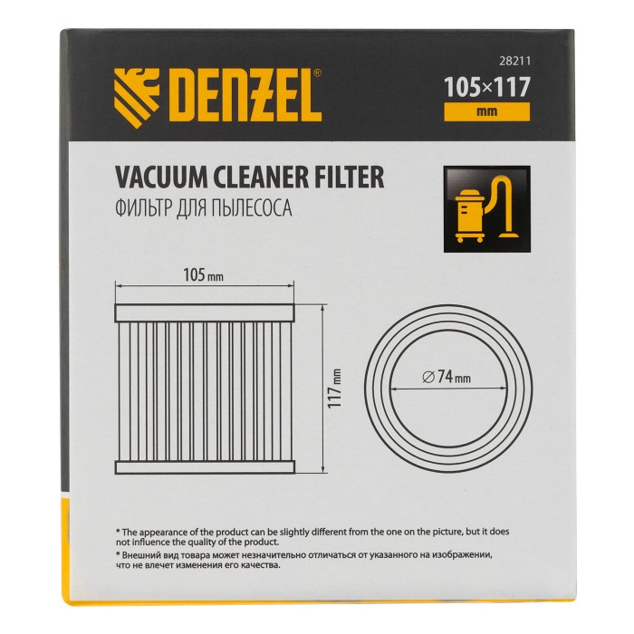 Каркасный складчатый HEPA-фильтр Denzel 28211 совместим со строительными пылесосами SVC15 (28201), LVC15 (28291). Устанавливается на корпус фильтра пылесоса и используется для проведения сухой уборки. Имеет класс фильтрации L, успешно справляется с частичками лака, краски, искусственного камня и т.п.ПреимуществаЭффективность — фильтрующий элемент задерживает мелкие частицы пыли, исключая их попадание обратно в воздух.Простая подготовка к работе — установка фильтра не занимает много времени.Удобная упаковка — изделие поставляется в картонной коробке, защищающей его от загрязнений и повреждений.