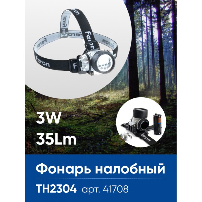 Фонарь на батарейках FERON TH2304 фонарь головной , IP44, , количество режимов 4, время работы 18, цвет серый, 70*55*70мм...