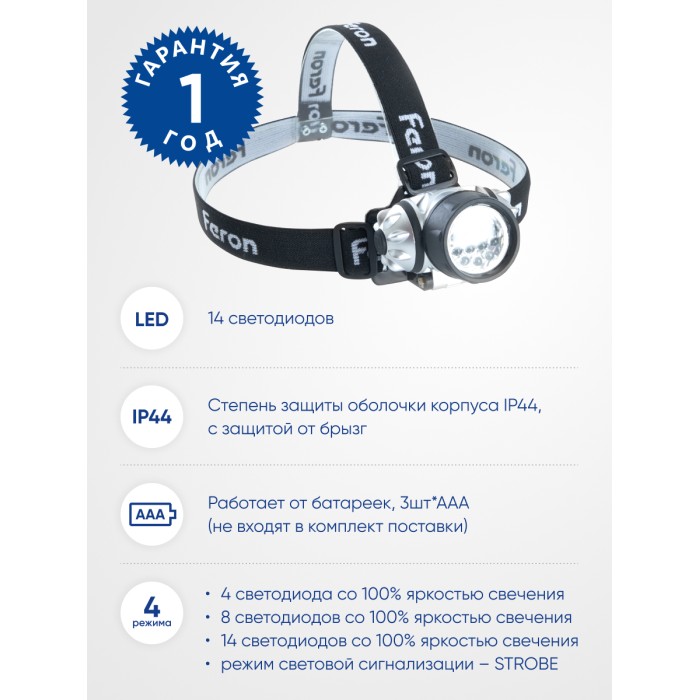 Фонарь на батарейках FERON TH2304 фонарь головной , IP44, , количество режимов 4, время работы 18, цвет серый, 70*55*70мм
