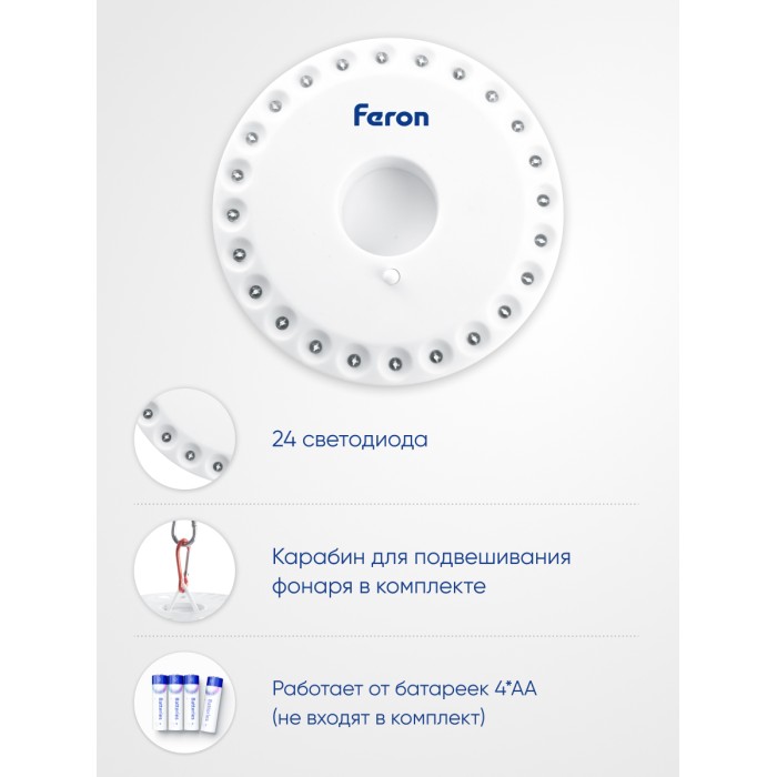 Фонарь на батарейках FERON TH2501 фонарь ручной с дополнительной подсветкой, IP20, , количество режимов 1, время работы 20 часов, цвет белый, 135*135*16мм