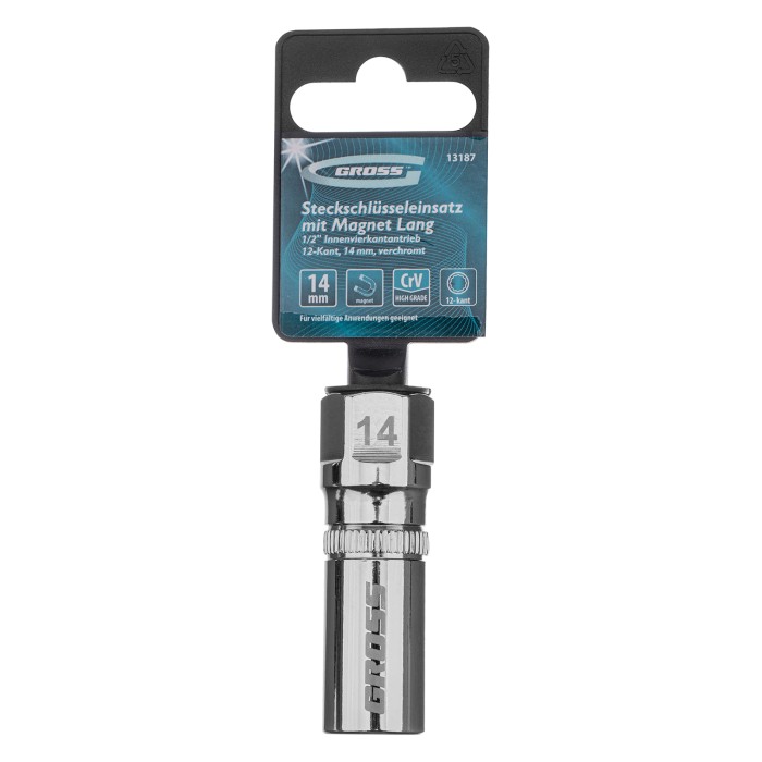 Свечная торцевая головка Gross 13187 под квадрат 1/2 дюйма, магнитная, 12-гранная, размером 14 мм, пригодится автомобилистам для замены и чистки свечей зажигания. Благодаря магнитному держателю позволяет надежно зафиксировать и быстро извлечь свечу. Торцевая головка длиной 65 мм и с 12-гранным зевом удобна для работы в ограниченном пространстве.ПреимуществаПрочность — торцевая головка из высококачественной стали CrV-группы устойчива к нагрузкам.Долгий срок службы — полированное хромовое покрытие предотвращает образование коррозии и защищает головку от разрушения.Комфортная работа — головка не выскальзывает из рук благодаря специальным насечкам на корпусе.