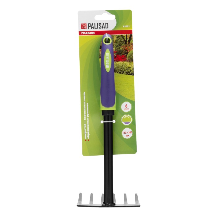 Стальные 6-зубые грабли Palisad LSR1 62061, 110 х 300 мм, с обрезиненной эргономичной рукояткой используются для удаления мелкого мусора и срезанных стеблей, а также для рыхления почвы на небольших участках клумбах, грядках. Инструмент пригодится во время работы в цветнике или огороде.ПреимуществаГрабли изготовлены из высокопрочной среднеуглеродистой стали, а значит, прослужат долго и не сломаются. Инструмент не ржавеет благодаря покрытию из порошковой эмали. Двухкомпонентная обрезиненная рукоятка эргономичной формы удобно ложится в руки и снижает усталость во время работы.
