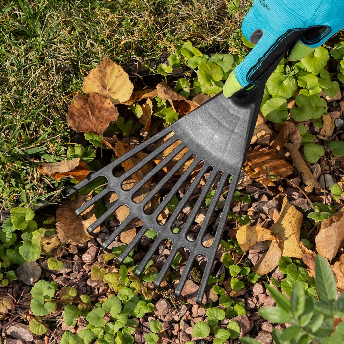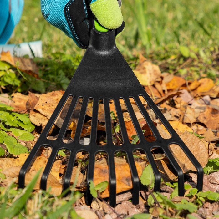 Веерные 9-зубые грабли Palisad NYLON 62395 размером 175 х 350 мм, пластиковые, используются для выполнения мелких садово-огородных работ. Благодаря 9 упругим зубьям с плоским профилем они оптимальны для сбора мелкого мусора и срезанных отростков в цветниках и на грядках.ПреимуществаПрочность и долговечность — грабли изготовлены из эластичного полипропилена, не подверженного действию ультрафиолета.Комфортная работа — рукоятка с упором для пальца удобно ложится в ладонь.Удобное хранение — отверстие в рукоятке позволяет подвешивать грабли на крючок или гвоздь.