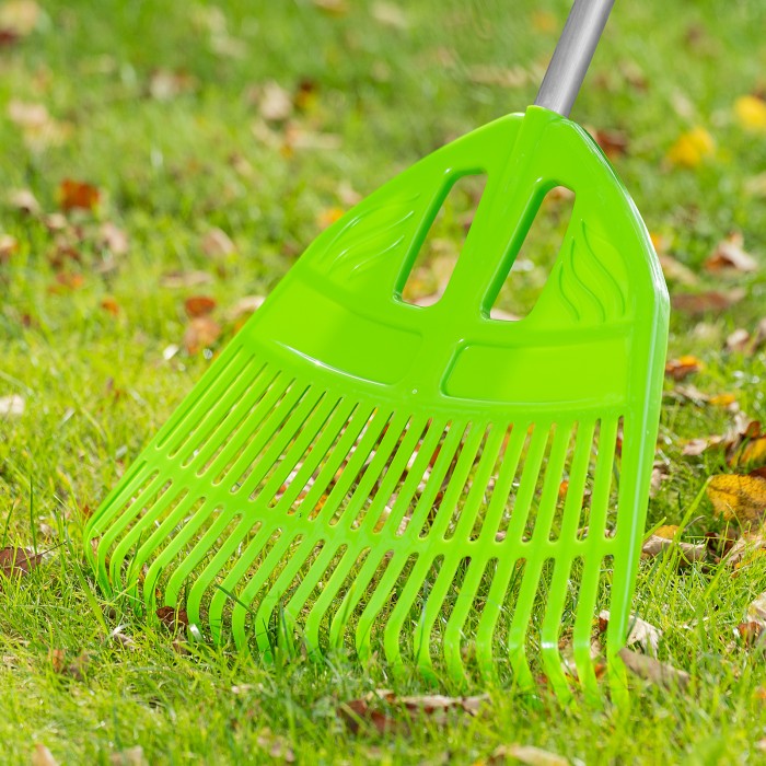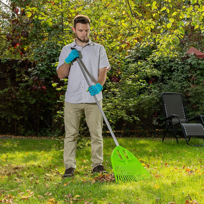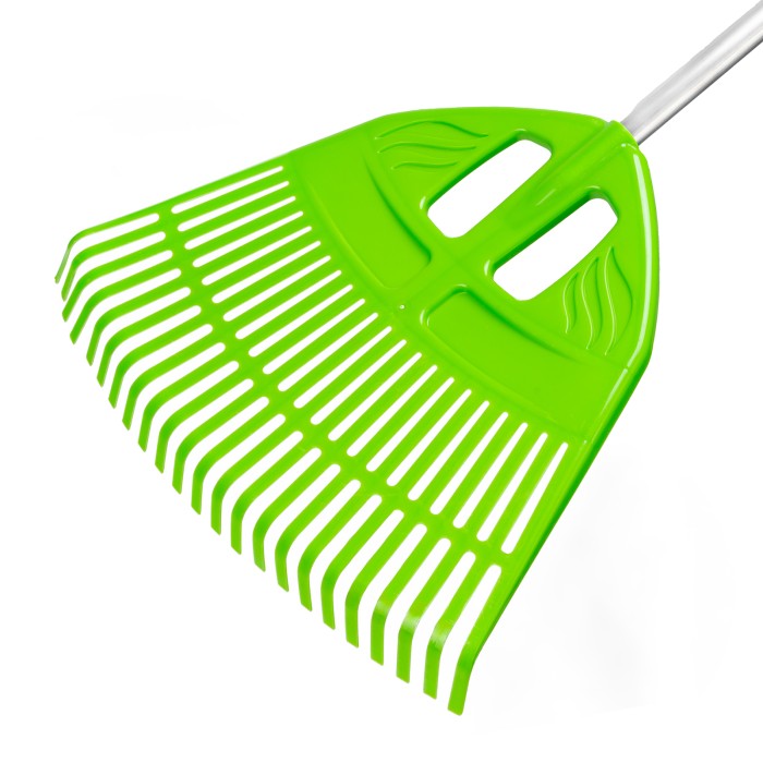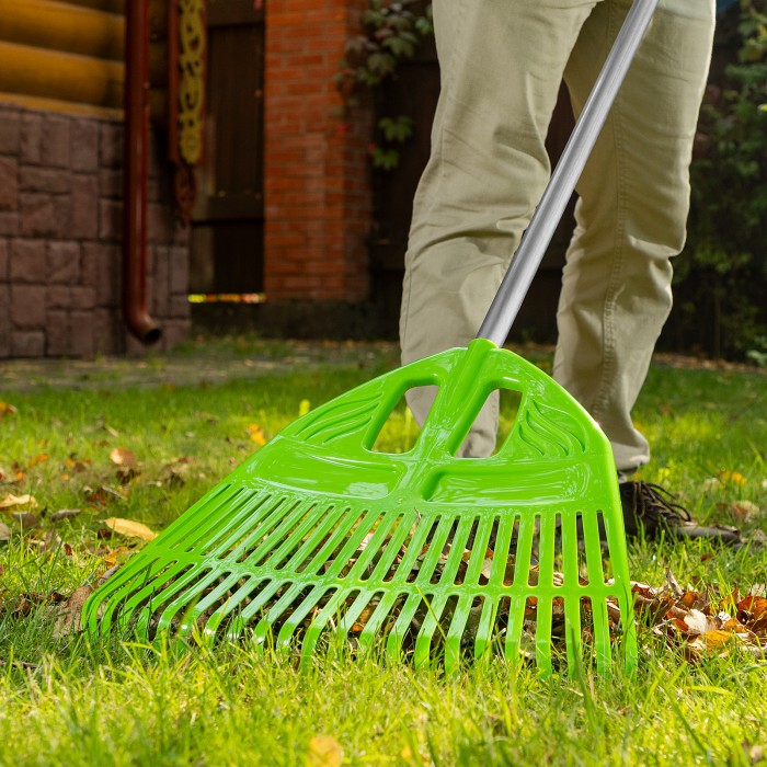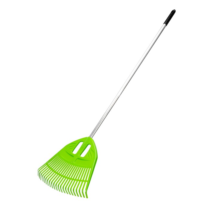Пластиковые веерные грабли Palisad 61805 размером 495 x 1680 мм, с 23 плоскими зубьями, рабочей частью шириной 495 мм и алюминиевым черенком, — садовый инвентарь, предназначенный для очищения газонов и грядок от мелкого ...