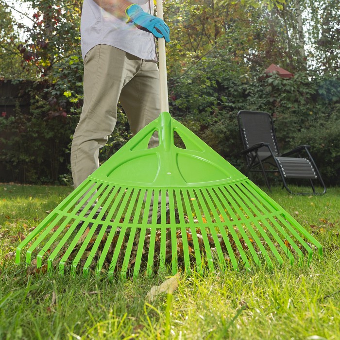 Веерные пластиковые грабли Palisad 61709 с 27 плоскими зубьями, с рабочей частью шириной 620 мм, без черенка, предназначены для уборки мелкого мусора и листьев с газонов и грядок. Благодаря плоским зубьям эффективно очищ...
