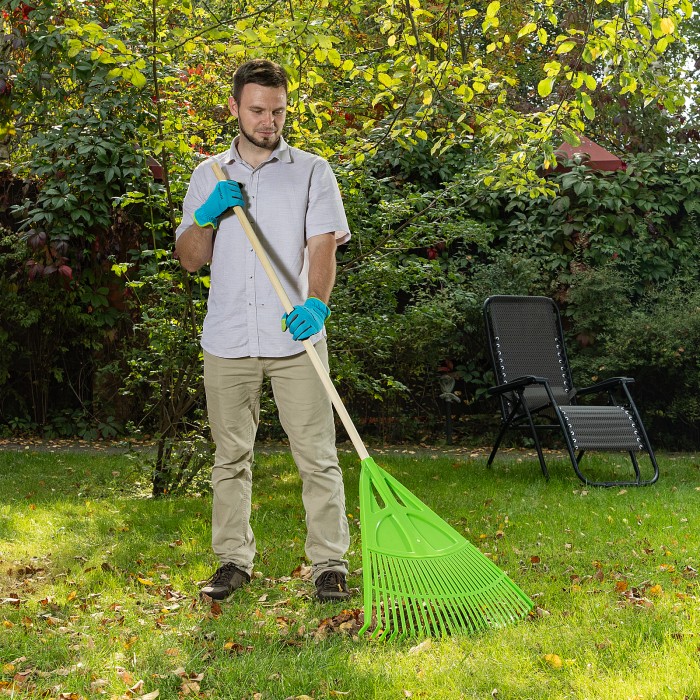 Веерные пластиковые грабли Palisad 61709 с 27 плоскими зубьями, с рабочей частью шириной 620 мм, без черенка, предназначены для уборки мелкого мусора и листьев с газонов и грядок. Благодаря плоским зубьям эффективно очищают территорию, не повреждая растительность. Грабли совместимы с черенками под тулейку диаметром 25 мм.ПреимуществаБыстрая уборка — рабочая часть шириной 620 мм обеспечивает максимальный охват участка.Надежность и долговечность — грабли изготовлены из эластичного и стойкого к ультрафиолету полипропилена.Защита от поломок — на основании имеются ребра жесткости, зубья дополнены распоркой.