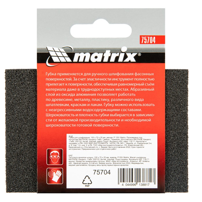 Мягкая губка для шлифования Matrix 75704 размером 100 х 70 х 25 мм, со среднезернистым абразивом P 120, используется для обработки деревянных, металлических, пластмассовых и шпатлеванных поверхностей, оптимальна для чистовой обработки. Позволяет удалять старые лакокрасочные покрытия и ржавчину, применяется при ремонте, строительстве, производстве мебели, кузовных работах, а также в быту. Губка покрыта абразивным слоем с 4-х сторон, поэтому прослужит долго.ПреимуществаВысокий ресурс — абразивным материалом служит оксид алюминия, долго сохраняющий режущие свойства.Удобная шлифовка различных поверхностей — губка выполнена в виде прямоугольника, благодаря мягкой поролоновой основе подходит для обработки углублений, выступов, пазов.Водостойкость — губку можно использовать для «мокрого» шлифования.