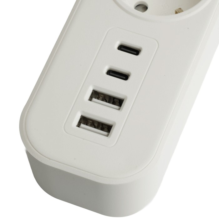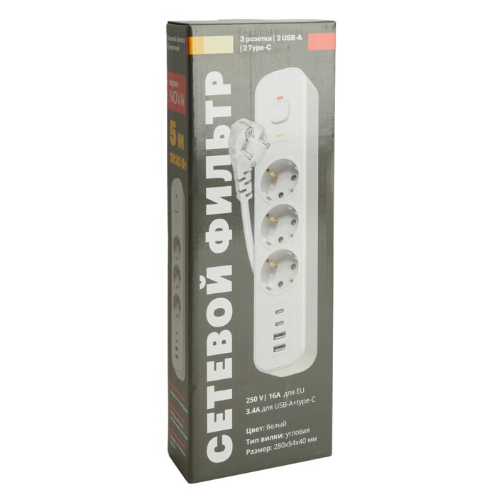 HM21-31-05 Сетевой фильтр 3-местный с/з 3x1мм2, 5 м, 250В, 16А, 2 USB-A+2 Type-C 3,серия Nova, белый