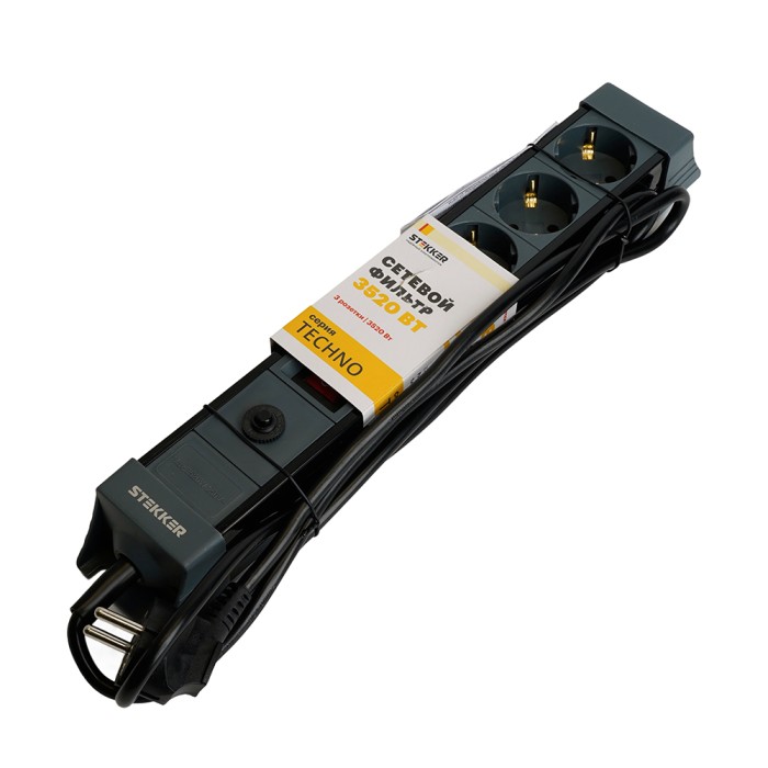 HM22-31-02 Сетевой фильтр 3-местный с/з 3x1мм2, 1,8 м, 250В, 16А, серия Techno, черный...