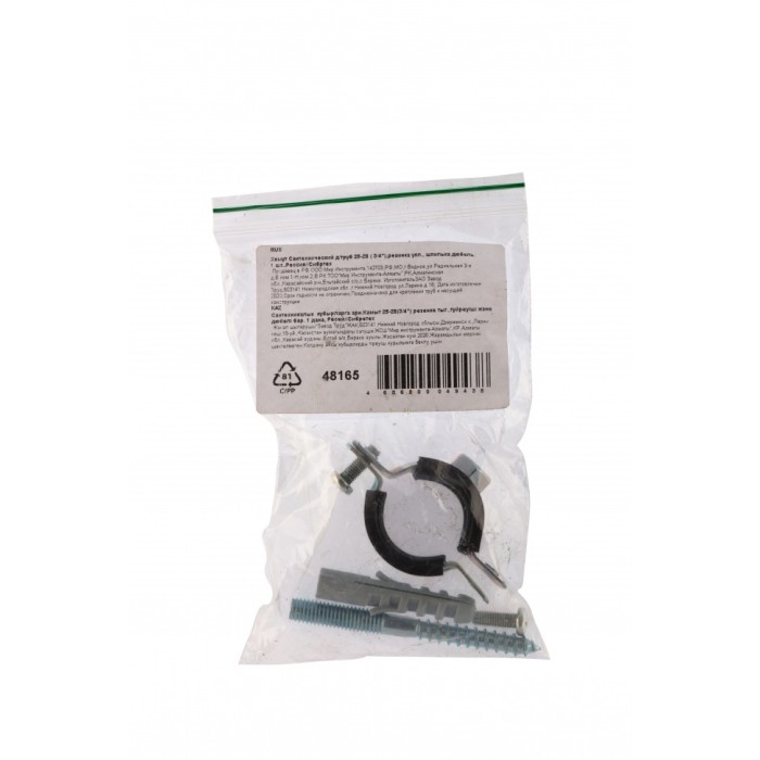 Сантехнический хомут для труб Сибртех 48165 с резиновым уплотнением, шпилькой и дюбелем, 1 шт. в упаковке, служит для крепления труб диаметром 25-28 мм (3/4"), может применяться для фиксации жестких, гибких воздуховодов ...