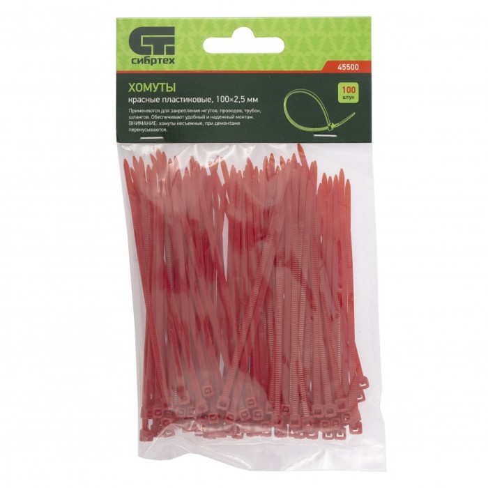 Красные пластиковые хомуты Сибртех 45500, 100 х 2,5 мм, 100 шт. в упаковке, используются для стяжки кабелей, закрепления трубок, шлангов, рекламных конструкций, а также для упаковки различных предметов. Пригодятся во вре...