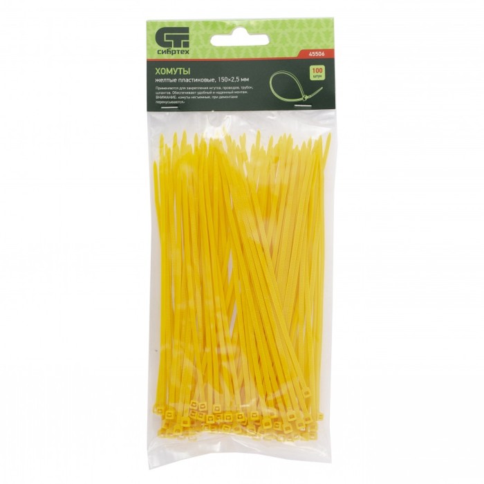 Желтые пластиковые хомуты Сибртех 45506, 150 х 2,5 мм, 100 шт. в упаковке, используются для стяжки кабелей, закрепления трубок, шлангов, рекламных конструкций, а также для упаковки различных предметов. Пригодятся во врем...